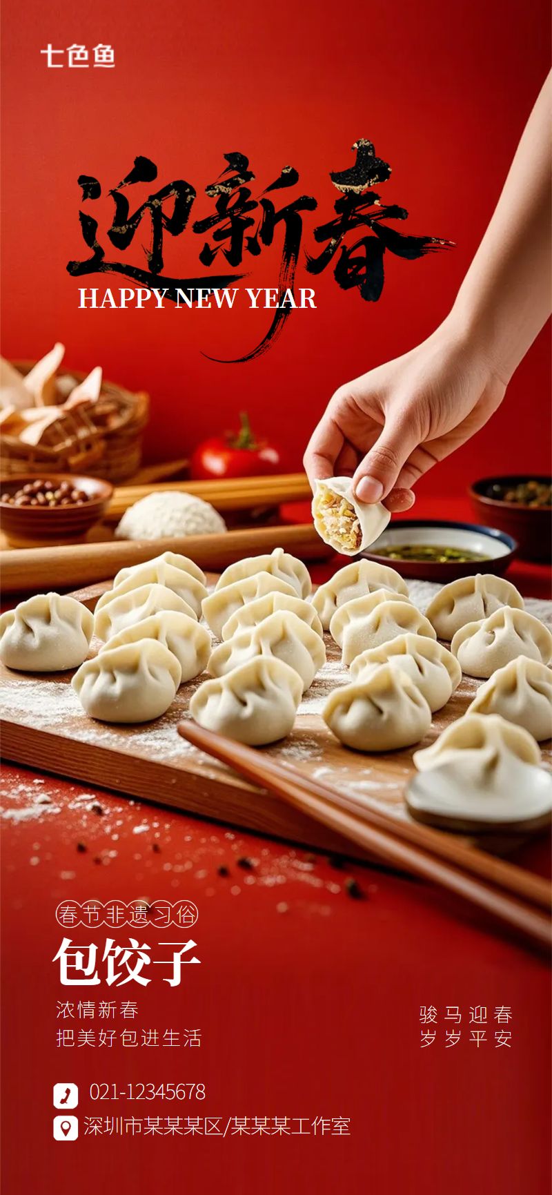 创意喜庆2026年马年包饺子传统习俗海报是设计师 笨笨的作品,模板尺寸为720*1280px,属于?社交>?手机海报模板 ,模板图片素材均支持免费下载,在线就近下单印刷。操作简单易懂,会打字就会做设计,七色鱼界面友好上手快,可适用于多种场景。七色鱼拥有海量模板素材,30万+模板免费用,行业覆盖丰富,全部模板只需拖拉拽,轻松改。满足中小型企业、创业公司、自媒体、学生和个体经营者的自助平面设计需求,还可进行云端储存管理、分享协作、营销传播、在线下单印刷等。
