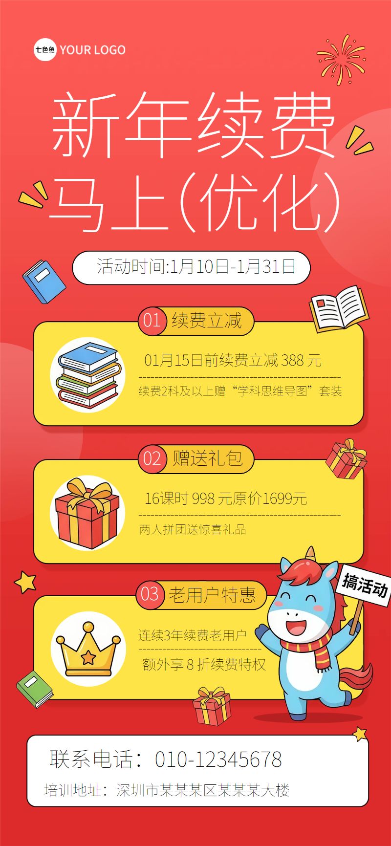 2026马年新年续费教育培训活动全屏海报是设计师 笨笨的作品,模板尺寸为720*1280px,属于?社交>?手机海报模板 ,模板图片素材均支持免费下载,在线就近下单印刷。操作简单易懂,会打字就会做设计,七色鱼界面友好上手快,可适用于多种场景。七色鱼拥有海量模板素材,30万+模板免费用,行业覆盖丰富,全部模板只需拖拉拽,轻松改。满足中小型企业、创业公司、自媒体、学生和个体经营者的自助平面设计需求,还可进行云端储存管理、分享协作、营销传播、在线下单印刷等。