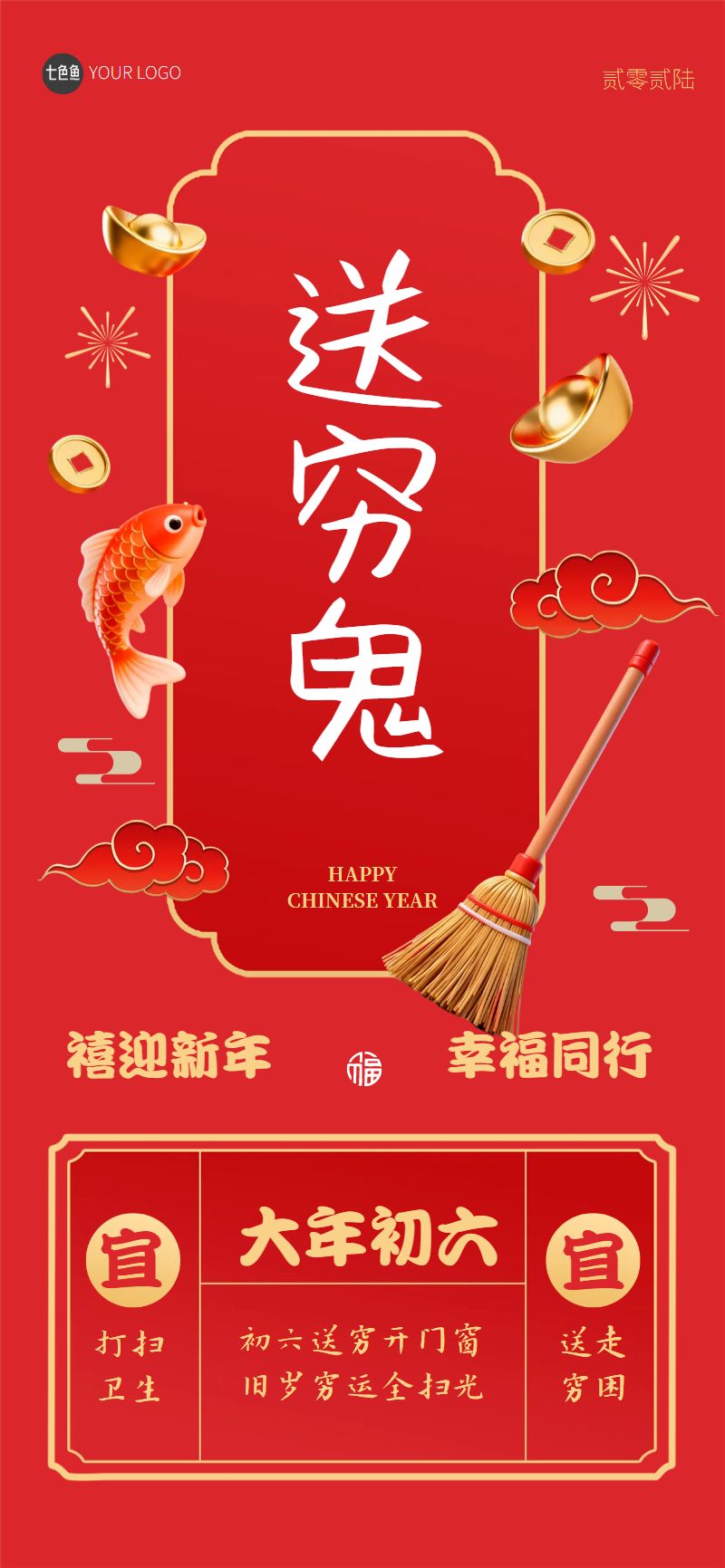 红色大气年俗大年初六全屏海报是设计师 笨笨的作品,模板尺寸为720*1280px,属于?社交>?手机海报模板 ,模板图片素材均支持免费下载,在线就近下单印刷。操作简单易懂,会打字就会做设计,七色鱼界面友好上手快,可适用于多种场景。七色鱼拥有海量模板素材,30万+模板免费用,行业覆盖丰富,全部模板只需拖拉拽,轻松改。满足中小型企业、创业公司、自媒体、学生和个体经营者的自助平面设计需求,还可进行云端储存管理、分享协作、营销传播、在线下单印刷等。