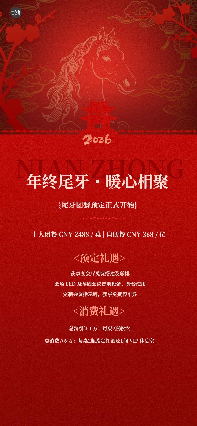 简约大气2026马年尾年尾牙宴预定全屏海报是设计师 笨笨的作品,模板尺寸为720*1280px,属于?社交>?手机海报模板 ,模板图片素材均支持免费下载,在线就近下单印刷。操作简单易懂,会打字就会做设计,七色鱼界面友好上手快,可适用于多种场景。七色鱼拥有海量模板素材,30万+模板免费用,行业覆盖丰富,全部模板只需拖拉拽,轻松改。满足中小型企业、创业公司、自媒体、学生和个体经营者的自助平面设计需求,还可进行云端储存管理、分享协作、营销传播、在线下单印刷等。