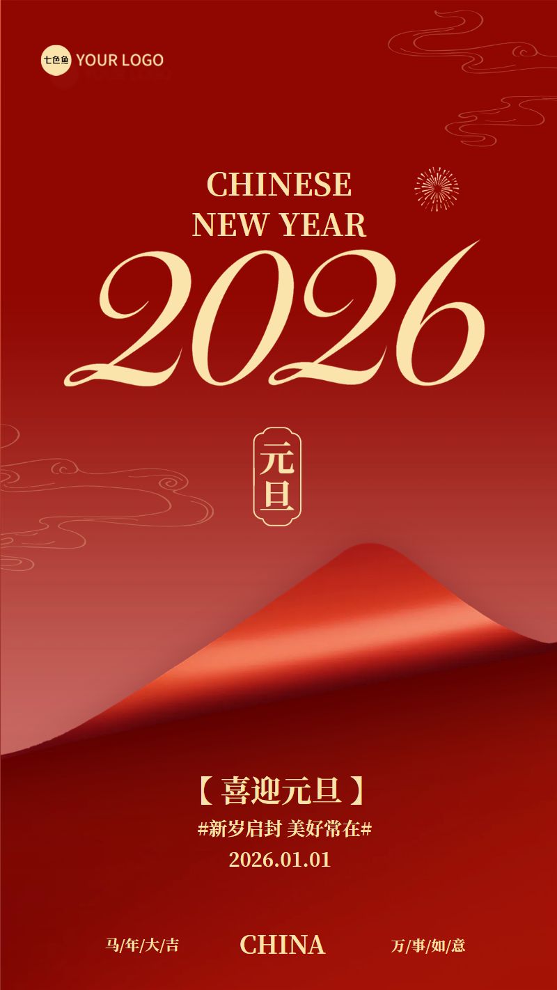 2026马年喜迎元旦祝福海报是设计师 笨笨的作品,模板尺寸为720*1280px,属于?社交>?手机海报模板 ,模板图片素材均支持免费下载,在线就近下单印刷。操作简单易懂,会打字就会做设计,七色鱼界面友好上手快,可适用于多种场景。七色鱼拥有海量模板素材,30万+模板免费用,行业覆盖丰富,全部模板只需拖拉拽,轻松改。满足中小型企业、创业公司、自媒体、学生和个体经营者的自助平面设计需求,还可进行云端储存管理、分享协作、营销传播、在线下单印刷等。