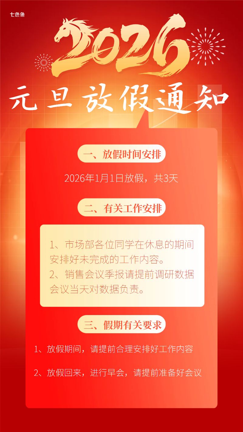 2026马年元旦放假通知手机海报是设计师 笨笨的作品,模板尺寸为720*1280px,属于?社交>?手机海报模板 ,模板图片素材均支持免费下载,在线就近下单印刷。操作简单易懂,会打字就会做设计,七色鱼界面友好上手快,可适用于多种场景。七色鱼拥有海量模板素材,30万+模板免费用,行业覆盖丰富,全部模板只需拖拉拽,轻松改。满足中小型企业、创业公司、自媒体、学生和个体经营者的自助平面设计需求,还可进行云端储存管理、分享协作、营销传播、在线下单印刷等。